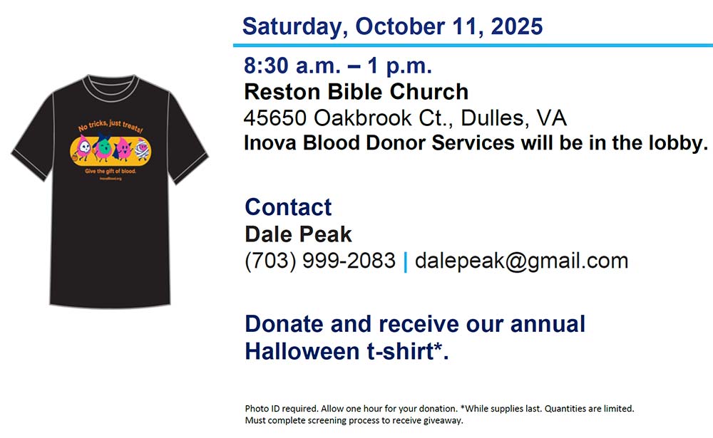 Reston Bible Church and Christian Fellowship Church will be sponsoring a blood drive at RBC on Saturday, December 13 , from 8:30 a.m. to 1:00 p.m.