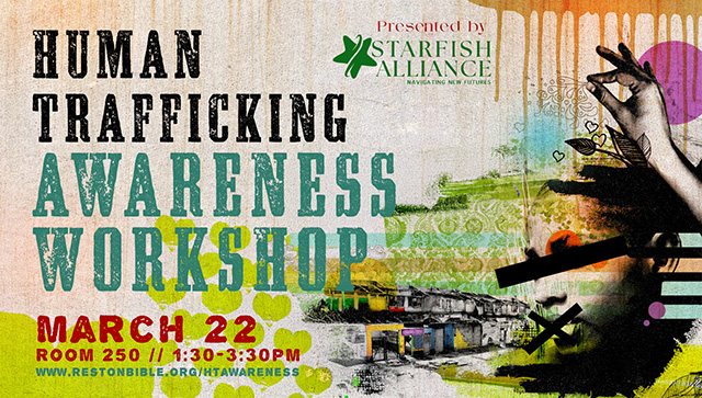 Join us on Sunday, March 22, 1:30-3:30 pm in Room 250 for a 2-hour workshop designed to equip you to recognize human trafficking and know how to safely respond to it. Conducted by Starfish Alliance, a new organization begun by several RBCers, including Pastor Jim Supp, this powerful interactive adult learning experience will help you understand what this travesty looks like, how it exists, and ways you can care for those around you.