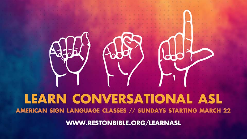 We have a growing ASL community and ministry here at Reston Bible Church. This class is a great opportunity to learn, practice, and build meaningful connections! If you are interested in learning the basics of conversational ASL, join us for an 8-week class starting Sunday, March 22 from 2:00-3:30pm in the Youth Building.