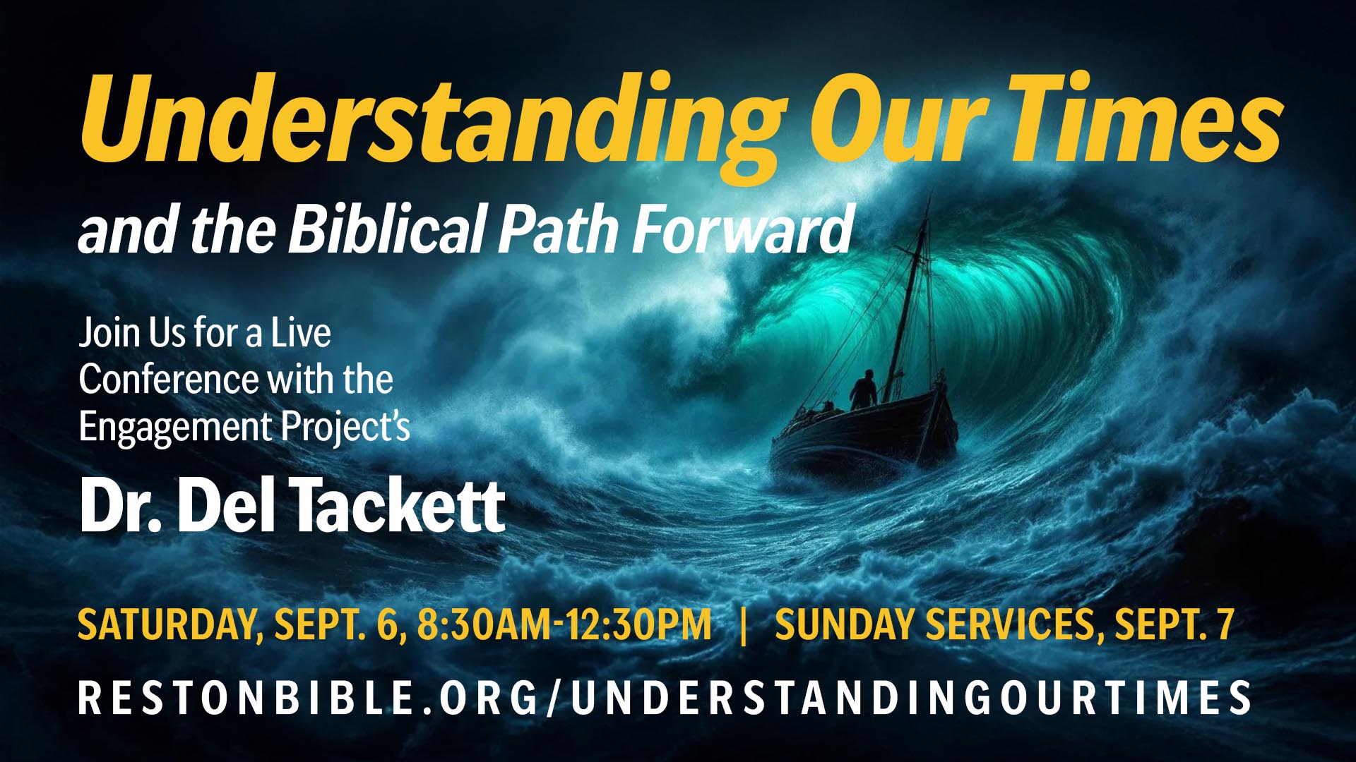 We are excited to announce that Dr. Del Tackett will be coming in person to Reston Bible Church on Saturday, September 6, to teach his Understanding The Times Conference. The event will go from 8:30 a.m. to 12:30 p.m. Dr. Tackett will also be speaking at both services on Sunday, September 7.