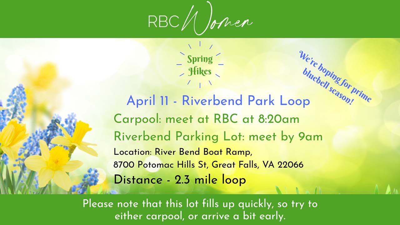 This is an easy 2.3 mile loop. April showers could make it muddy, so wear appropriate shoes. We hope you can join us, and bring a friend! If you’d like to join the WhatsApp group for real time updates, please contact Kris at krisfredericks@restonbible.org.