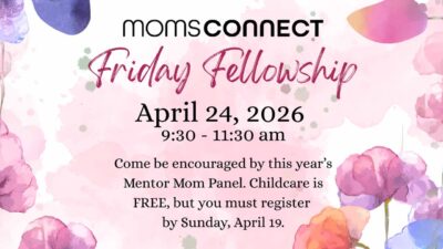 Moms Connect Fellowships are for moms of all ages. Each fellowship includes a speaker and lots of time to connect with other moms.